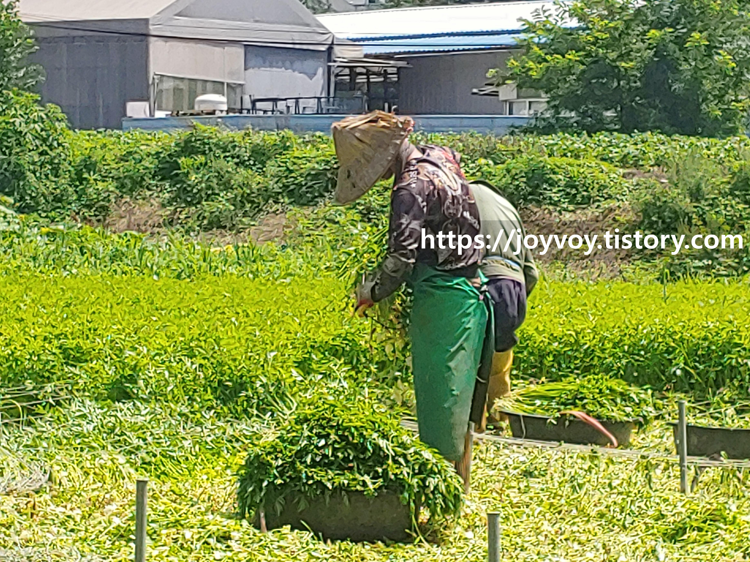 1994년경인가 경기도 남양주 지역신문에 재직하면서 경험한 겨울 미나리 채취가 겹쳐지는 장면이다 가두리 양식처럼 물이 찰랑찰랑한 습지에서만 채취하는 줄 알았더니 아니었다 지난 29일 경기도 화성시 매송면 숙곡리 농지에서 외국인 노동자들이 미나리를 수확하고 있다 외국인 노동자라고는 꿈에도 생각하지 못하다가 몇 마디 이야기를 나누고서야 이들이 외국인인 것을 알았다 농업 취업 비자로 입국한 분들인가? 열기 가득한 7월 땡볕에 동남아 모자를 쓰고 미나리를 수확하는 모습이 웬지 편하게 다가오진 않는다