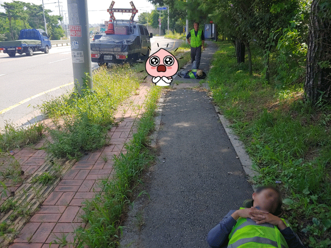 한여름 무더위를 체감하는 16일 정오를 지나 대부분 식사를 마쳤을 시각이다. 경기도 화성시 봉담읍 수영리 수영오거리에서 수원시 권선구 오목천삼거리 사이 방송대 인근 보행로 지나며 아주 보기 어려운 광경을 목격했다 사람들의 통행이 정말 드문 구간이어서였는지 사람들이 누워 있었다. 일에 지친 근로자들이 보행로에 드러누워 점심시간을 휴식하고 있다 휴대폰을 세로로 찍고 가로로 해서 찍으니 같은 업무를 하는 근로자 한 명이 뭐라고 했는데 블루투스 이어폰을 끼고 있어 못들고 지나쳤다 이후 인근 지역에서의 짧은 업무를 마치고 되돌아와 보니 이미 사라졌다
